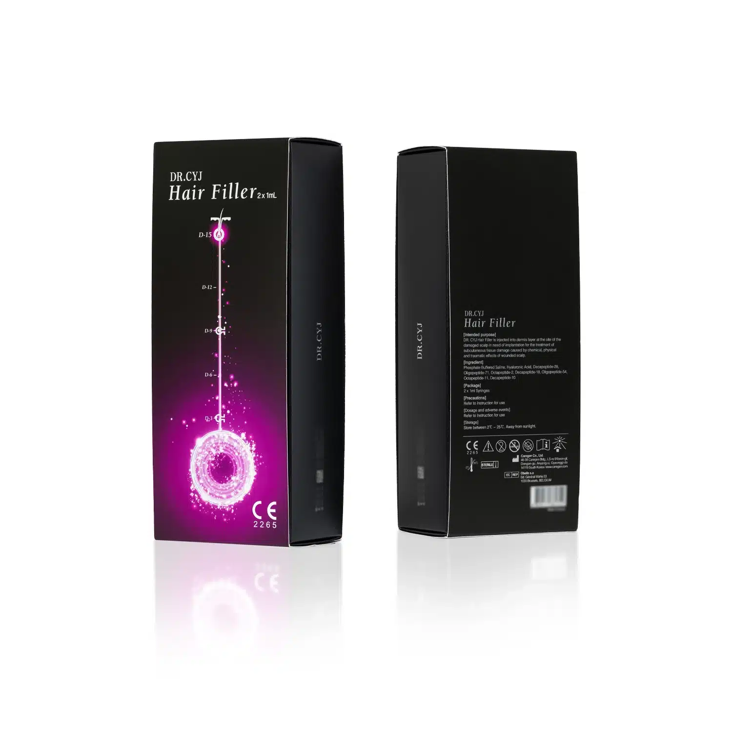 CYJ Hair Filler 2x1ml is a scalp revitalization injectable designed to treat subcutaneous tissue damage caused by chemical, physical, or traumatic effects. It contains 0.7% non-animal Hyaluronic Acid and a patented peptide complex that helps to stimulate hair regrowth, improve scalp condition, and reduce hair loss. The product comes as a clear, sterile, single-use solution and is injected into the superficial or medium dermis of the scalp. It is particularly effective for early stages of alopecia, damaged scalp, and as a post-procedure booster for transplant patients.