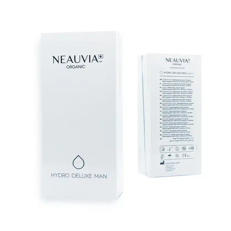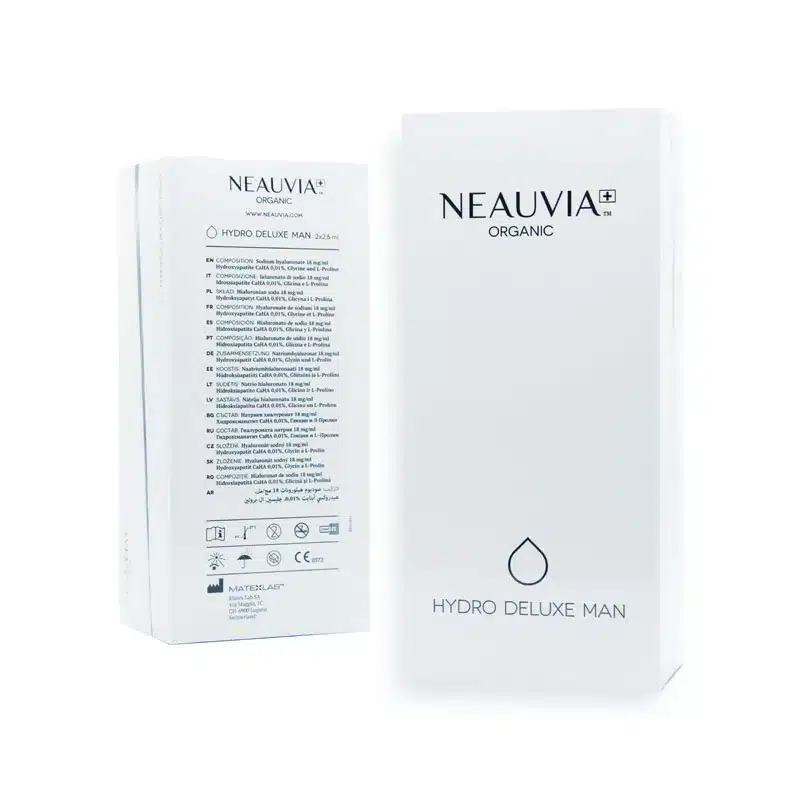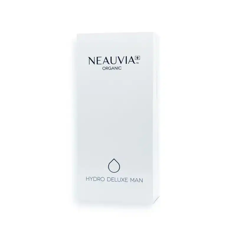 NEAUVIA™ ORGANIC HYDRO DELUXE MAN is a non-crosslinked hyaluronic acid revitalizing filler specifically designed to address the unique skin physiology of men. It delivers deep hydration, improves elasticity, and stimulates collagen production through its advanced formulation that includes 18 mg/mL of HA, Glycine, L-Proline, and 0.01% calcium hydroxyapatite (CaHA).