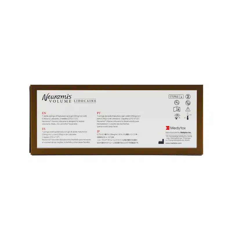 This filler contains 20 mg/mL of HA and 0.3% lidocaine, ensuring both effective augmentation and patient comfort during injection. NEURAMIS® VOLUME with Lidocaine is manufactured by Medytox, a global biotech company, and is FDA Drug Master File registered and EDQM certified for superior quality and biocompatibility.