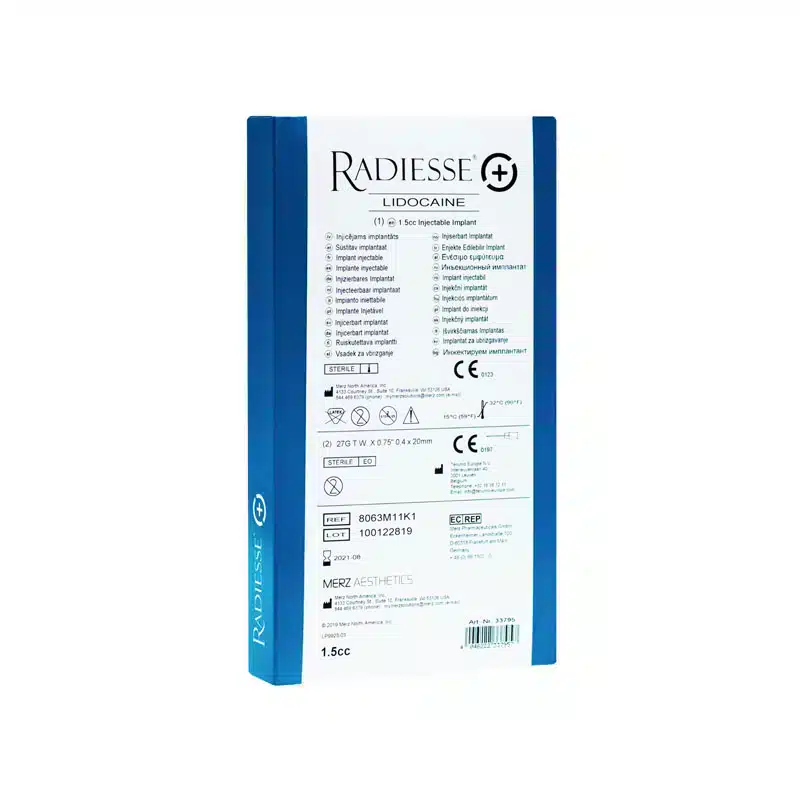 Radiesse®+ Lidocaine is an injectable dermal filler with lidocaine that temporarily adds volume to help smooth moderate to severe facial wrinkles and gives an immediate lifting and firming effect on the skin. Once injected, Radiesse® Plus 1.5ml provides the volume and lift needed to diminish signs of ageing. The product contains lidocaine, a powerful anaesthetic, for a more comfortable injection.