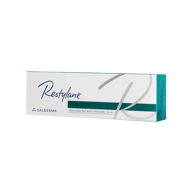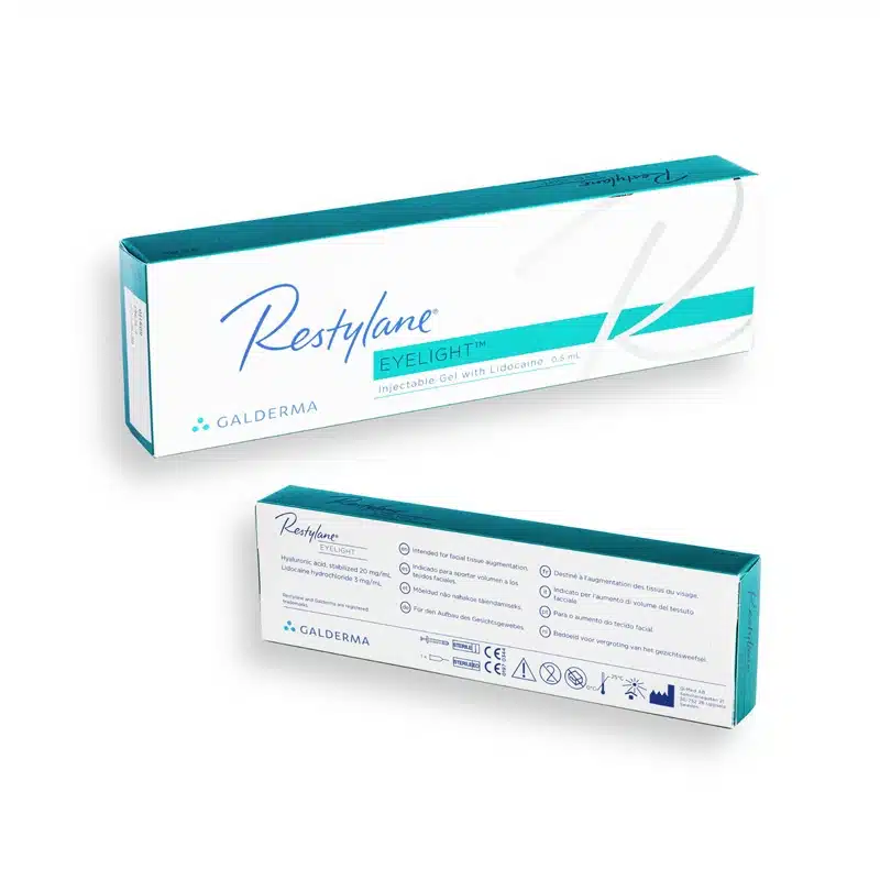RESTYLANE® EYELIGHT™ is an FDA-approved hyaluronic acid-based dermal filler specifically designed for the treatment of infraorbital hollowing (tear troughs) in adults aged 21 and older. It features 20 mg/mL of cross-linked HA suspended in phosphate-buffered saline and includes 0.3% lidocaine for improved patient comfort. The product uses NASHA™ technology to achieve a gel with high integration and optimal lift capacity, making it ideal for the delicate periorbital region. Clinical studies have shown that RESTYLANE® EYELIGHT™ provides visible improvements lasting up to 12 months, with a median injection volume of 1.2 mL and high satisfaction rates among patients. Its safety profile is supported by extensive clinical trials with low rates of serious adverse events.