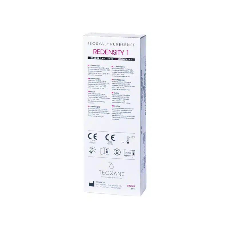 Teosyal® PureSense Redensity I is a unique hyaluronic acid-based skin enhancer which prevents premature skin from aging, restores skin density and maintains skin glow. Teosyal® PureSense Redensity I is suitable for the face, neck and also neckline, where skin is showing signs of dryness, cutaneous slackening, sun damage and aging.Used to add density to the dermis.