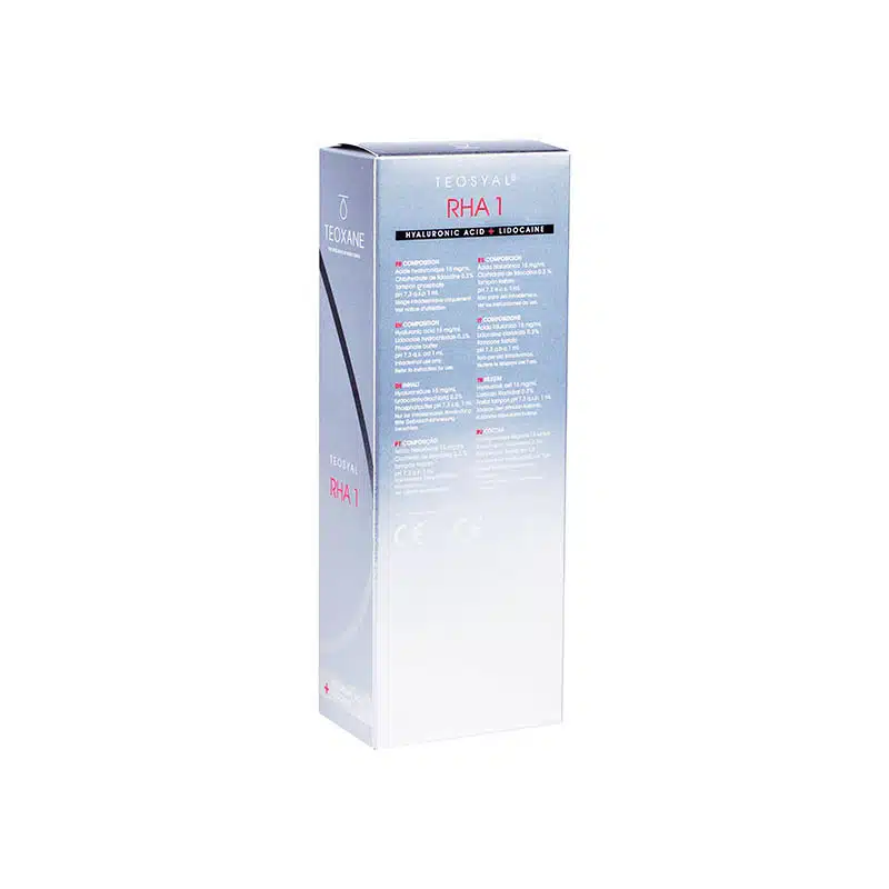 Teosyal® RHA 1 is a wrinkle filler product based on hyaluronic acid designed to support the skin in every move, while helping to preserve the vitality and softness of the face. This Teosyal® formulation is designed specifically to treat superficial and fine wrinkles. The products contain lidocaine, a powerful anaesthetic, for a more comfortable injection. Designed to correct small wrinkles, fine creases, and lines.