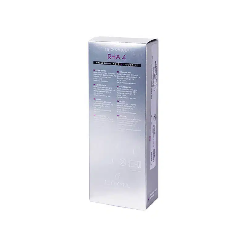 Teosyal® RHA 4 is a wrinkle filler product manufactured by Teoxane Laboratories, based on hyaluronic acid designed to support the skin in every move, while helping to preserve the vitality and softness of the face. Teosyal® RHA 4 Lidocaine is designed specifically to create volume in the deep skin layers and to treat skin depression and sagging skin. The product contains lidocaine, a powerful anaesthetic, for a more comfortable injection.Recreates volume over large areas, reduces signs of ageing and erases wrinkles on the cheeks, cheekbones, chin and contours of the face.